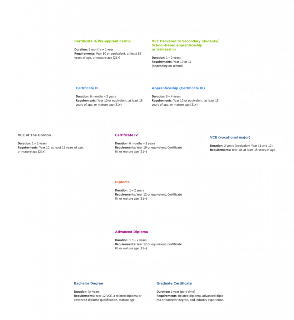This flow chart provides a general guide to each course level, their duration and entrance requirements, and their pathway to further study. Course duration indicated is full-time, and particular courses have their own part-time equivalent. Please check our website for specific course details.